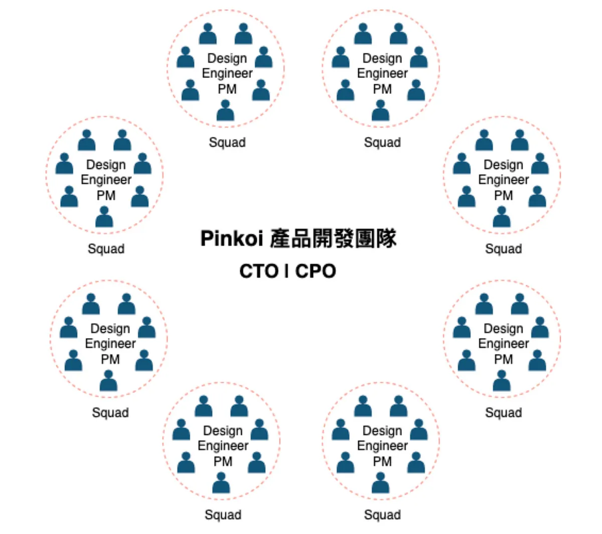 幕後には8つ以上の小隊(Squad Team)があり、例えばBuyer Squadは購入者側、Seller Squadは販売者側、Platform Squadは基盤、AI Squadはアルゴリズムなど、それぞれ異なる分野を担当し、共にPinkoiの製品を作り上げています。