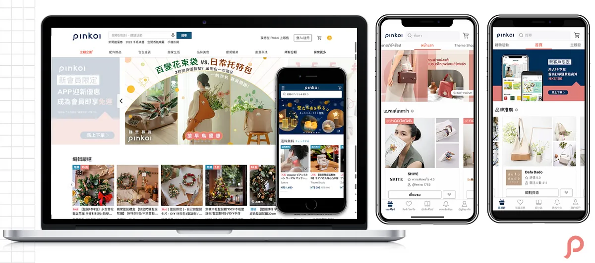 Pinkoi の製品は、パソコン版、スマートフォン版、iOS、Android の4つのプラットフォームと、繁体字中国語、香港繁体字、簡体字中国語、日本語、タイ語、英語の6言語に対応しています。