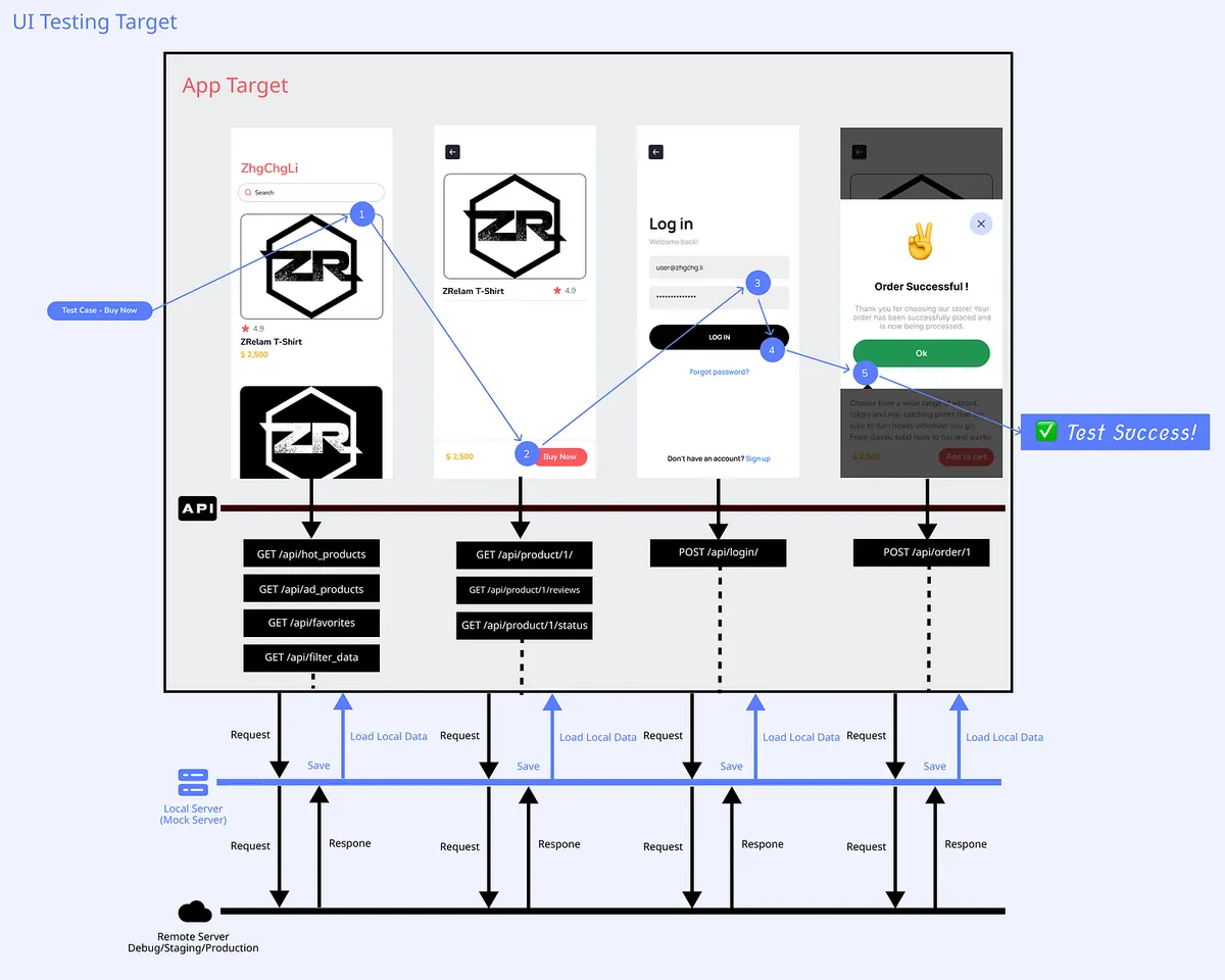購入フローのテストを行うとします。ユーザーがアプリを開き、ホーム画面で商品カードをタップして商品詳細ページに入り、下部の購入ボタンを押し、ログイン画面が表示されてログインを完了し、購入を完了すると、購入成功の通知が表示されます: