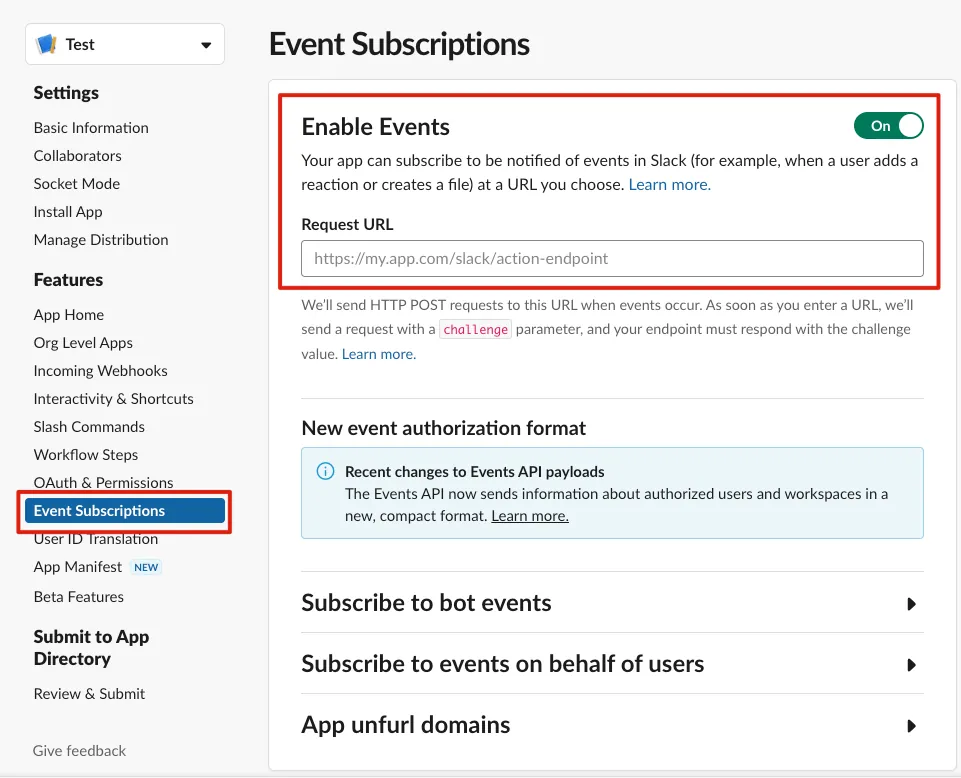 次に、Slack Appのイベントサブスクリプション機能を有効にします。指定したイベントが発生した際に、指定のURLへAPIが送信されます。