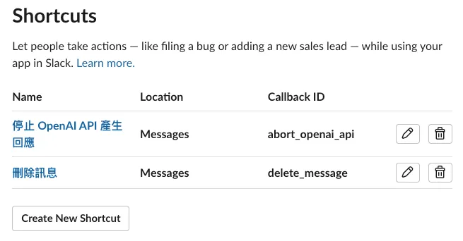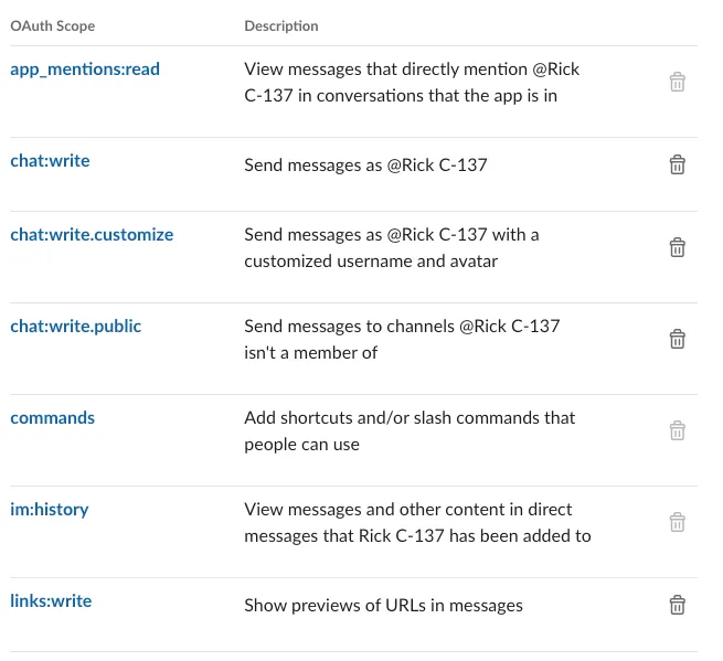 - 削除ボタンがグレーアウトしている項目は、ショートカットを追加した後にSlackが自動的に付与した権限です。