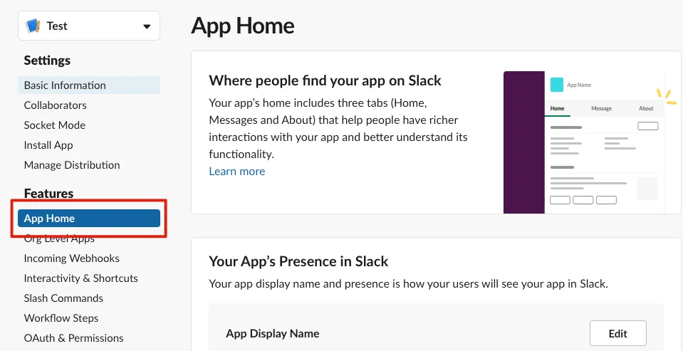 Slack Bot Token の権限設定が完了したら、「App Home」へ進みます:
