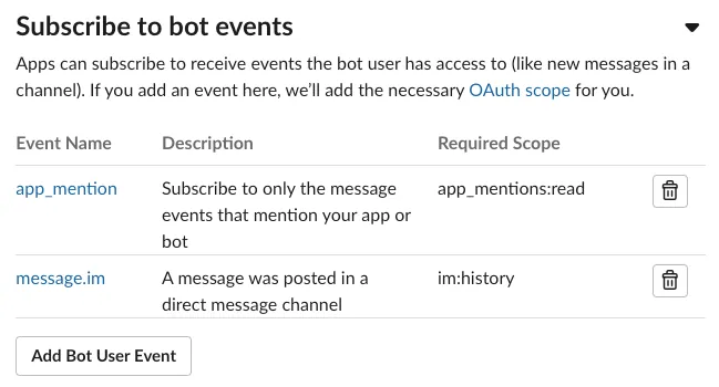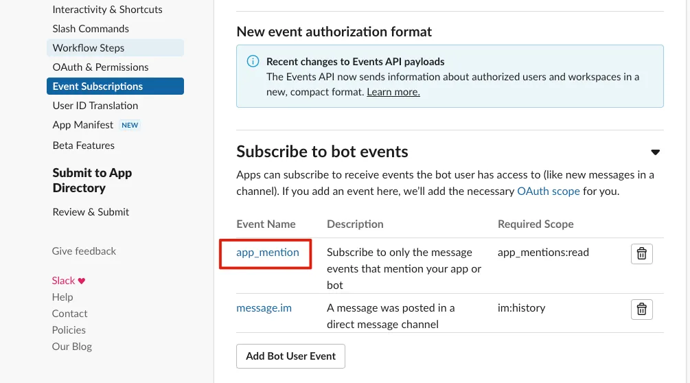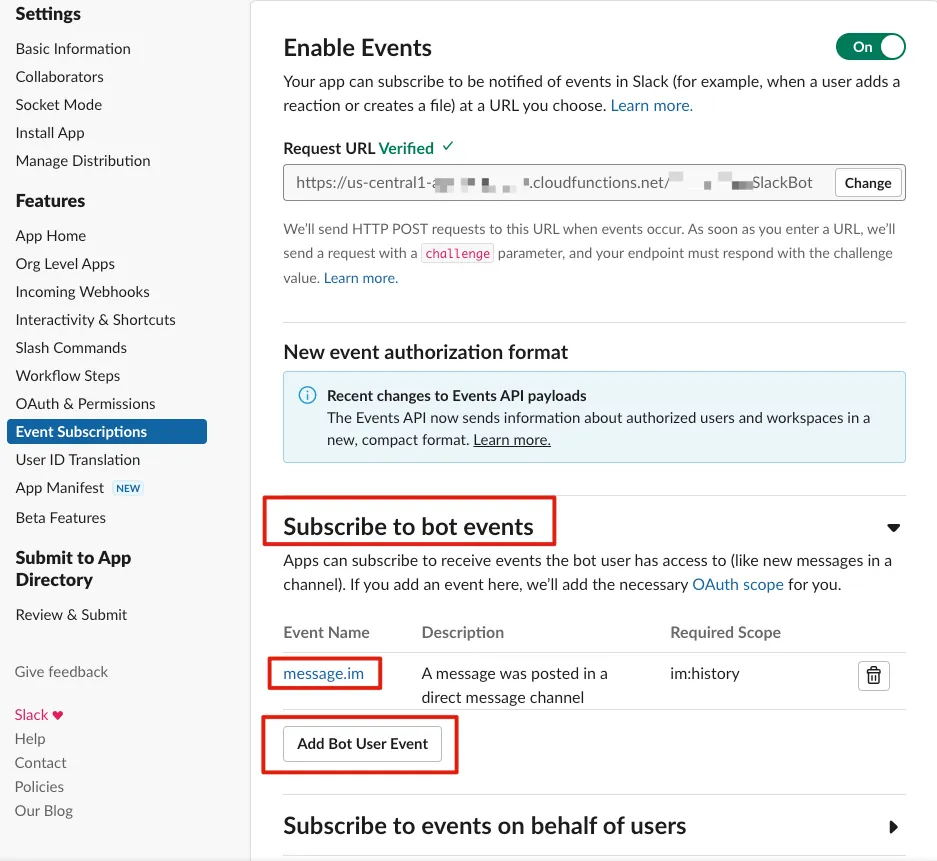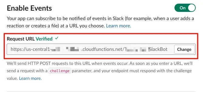 https://us-central1-xxx-xxx.cloudfunctions.net/SlackBot-Rick-C-137?token=nF4JwxfG9abqPZCJnBerwwhtodC28BuCボットイベントを購読する: