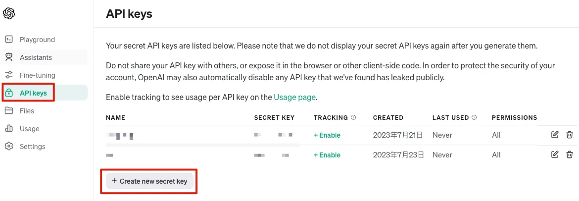 OpenAI API Key は こちらのページ から発行できます。Key 自体に対応するモデルバージョンはなく、使用時に利用するモデルバージョンを指定して、それに応じたトークン料金が発生します。