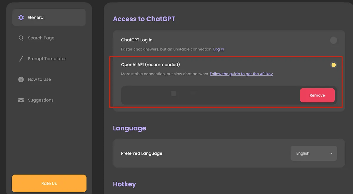 インストール後、設定 -> General -> に移動し、OpenAI API Key を入力してください。