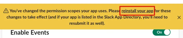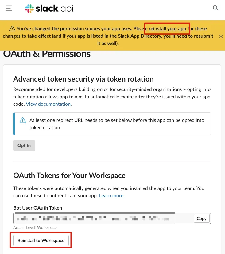 今後、Slack App に新しい権限が追加された場合は、再度「Reinstall」をクリックしないと反映されません。