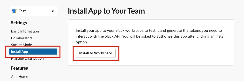 Bot 権限を追加した後、左側の「Install App」->「Install to Workspace」をクリックしてください。