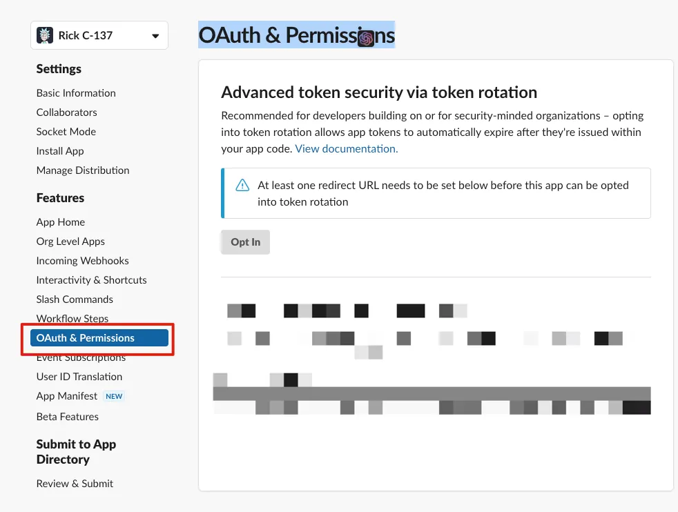 作成後、まず「OAuth & Permissions」でBotに必要な権限を追加します。