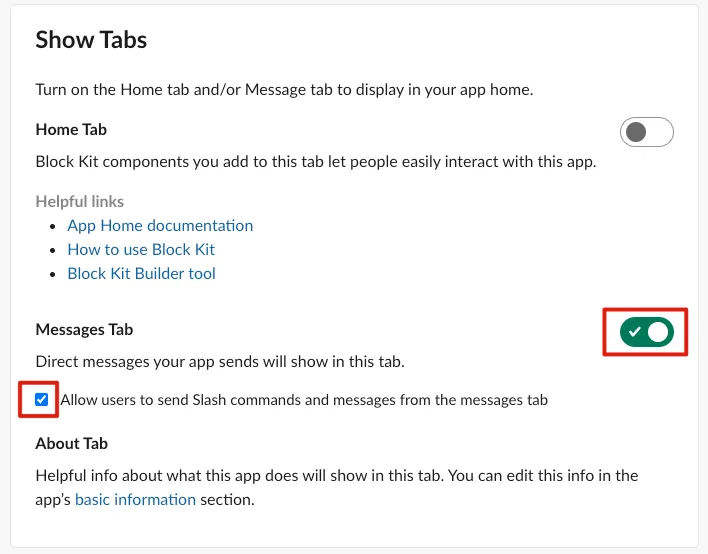 下にスクロールして「Show Tabs」セクションを見つけ、「Messages Tab」と「Allow users to send Slash commands and messages from the messages tab」を有効にします(これをチェックしないとメッセージを送信できず、「Sending messages to this app has been turned off.」と表示されます)。