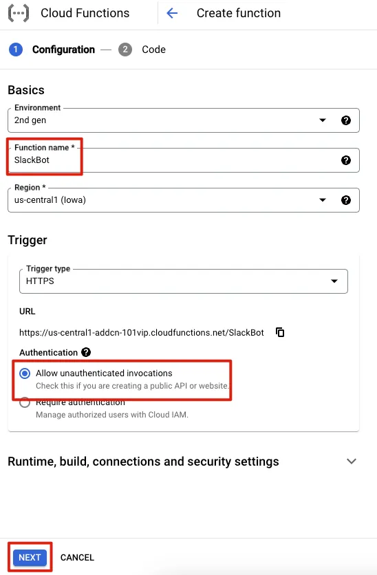 Function name にプロジェクト名を入力し、Authentication で「Allow unauthenticated invocations」を選択します。これはURLを知っていればアクセス可能という意味です。