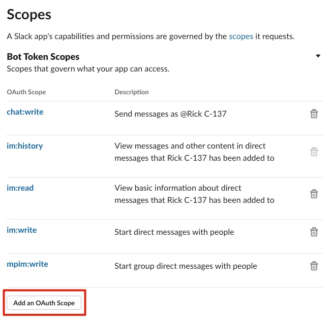 下にスクロールして「Scopes」セクションを見つけ、「Add an OAuth Scope」をクリックして、以下の権限を検索して追加してください: