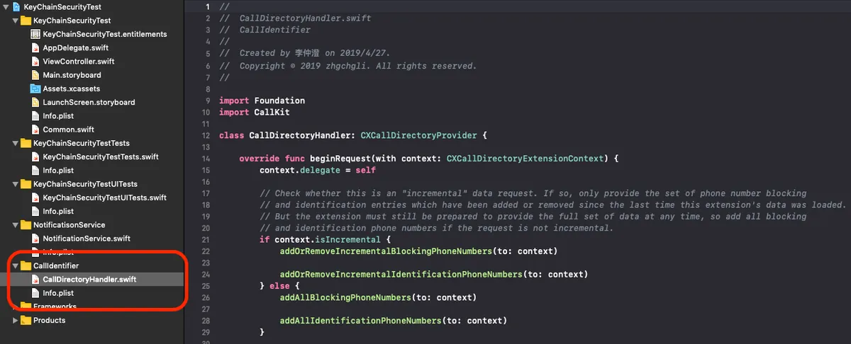 Call Directory Extension フォルダを開き、すでに作成されている CallDirectoryHandler.swift ファイルを見つけてください。