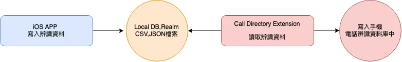 残念ながら、Call Directory Extensionに直接データを書き込むことはできません。そのため、対応する構造体を別途管理し、Call Directory Extensionがその構造体を読み取って識別データベースに書き込む必要があります。流れは以下の通りです: