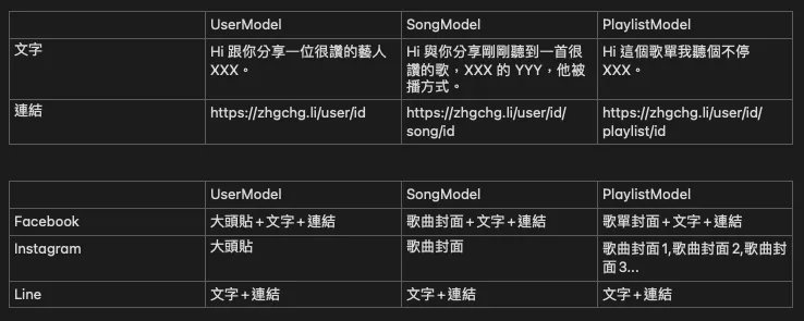 今日、以下の3つのモデルがあるとします:UserModel、SongModel、PlaylistModel。この3つのモデルに対して共有機能を実装します。共有先はFacebook、Line、Instagramの3つのプラットフォームです。各モデルが表示する共有メッセージは異なり、各プラットフォームが必要とするデータもそれぞれ異なります。