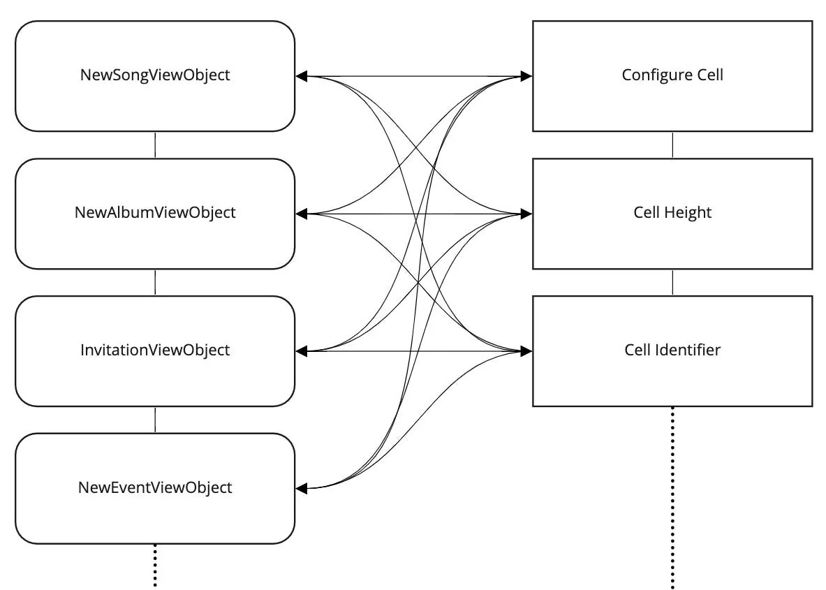 拡張・保守が困難:新しいタイプを追加する際に、この ViewController を変更する必要がある;cellForRow、heightForRow、willDisplay…が各関数に散らばっており、変更漏れや誤りが起きやすい