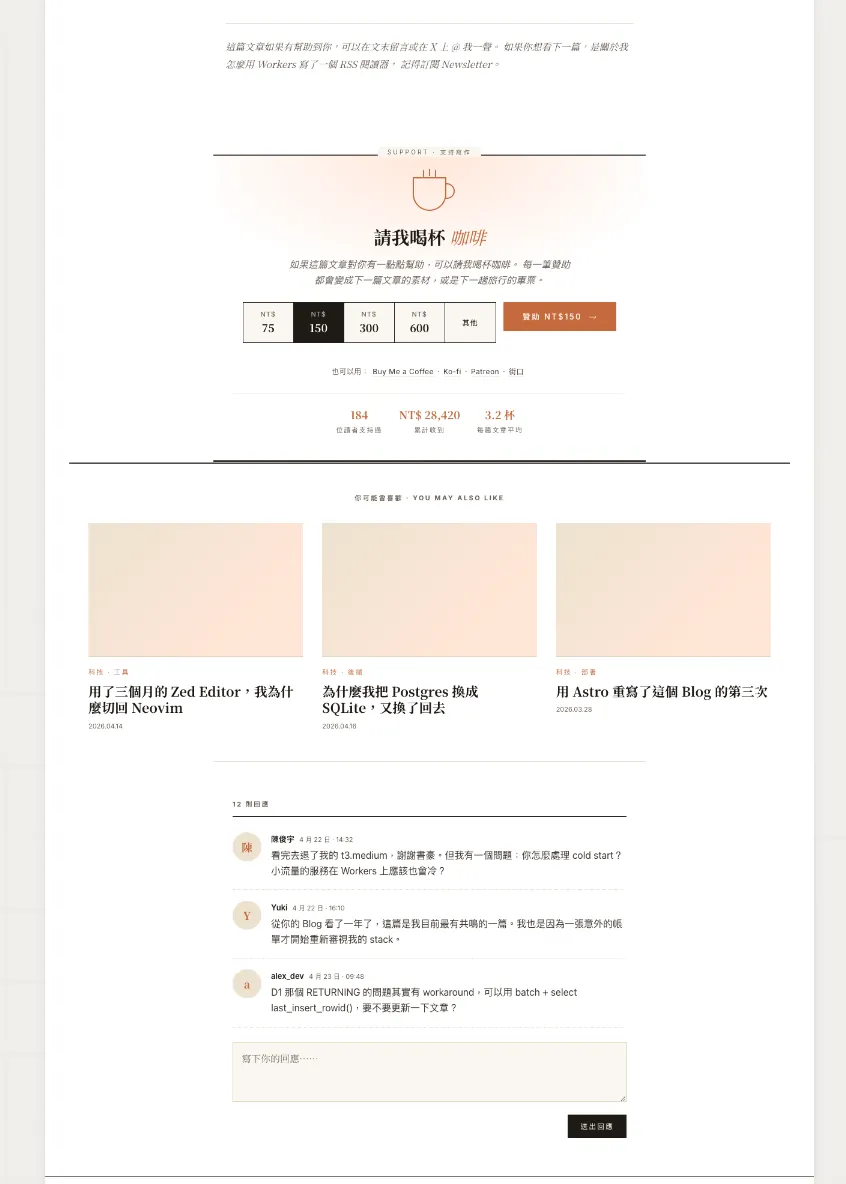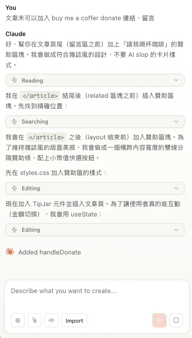 可以引き続きAIと対話して、必要な機能を追加したり既存の機能を調整したりできます。例えば、記事の末尾に「buy me a coffee」の寄付リンクやコメント機能を追加したい場合、私はこう伝えます: