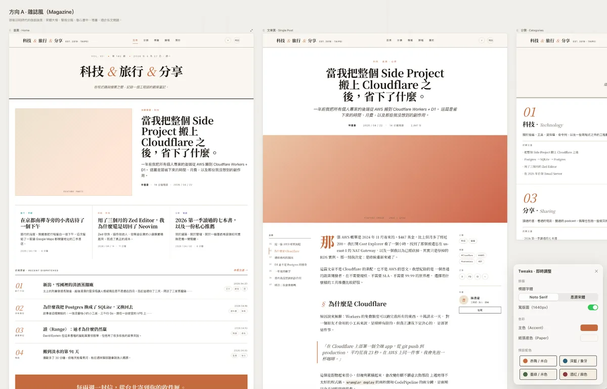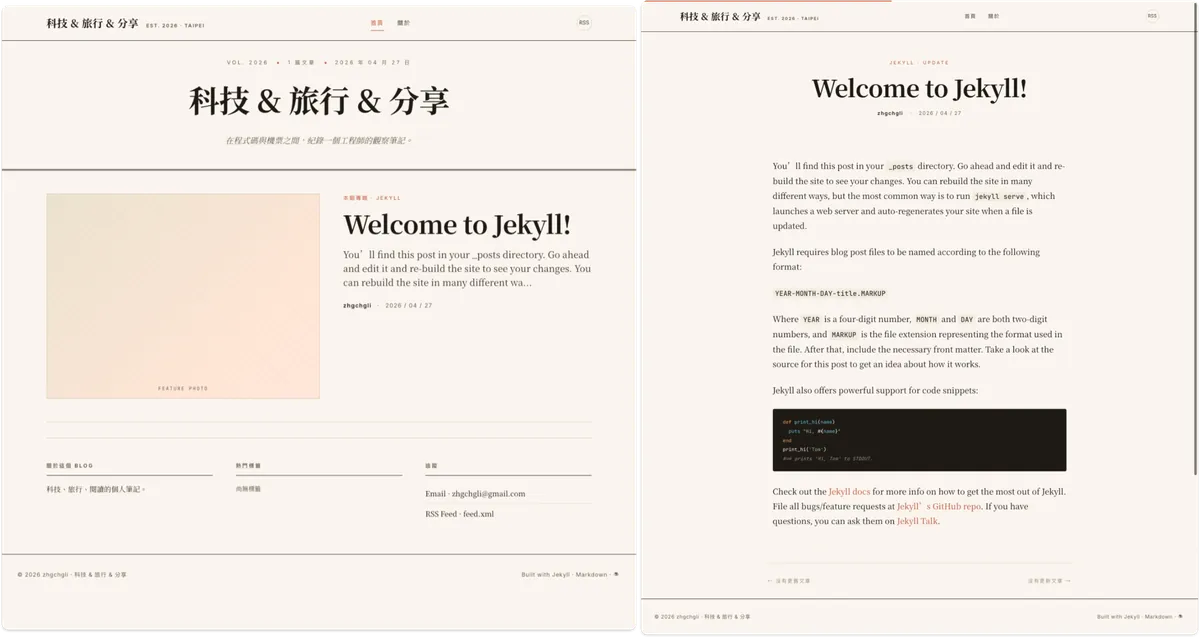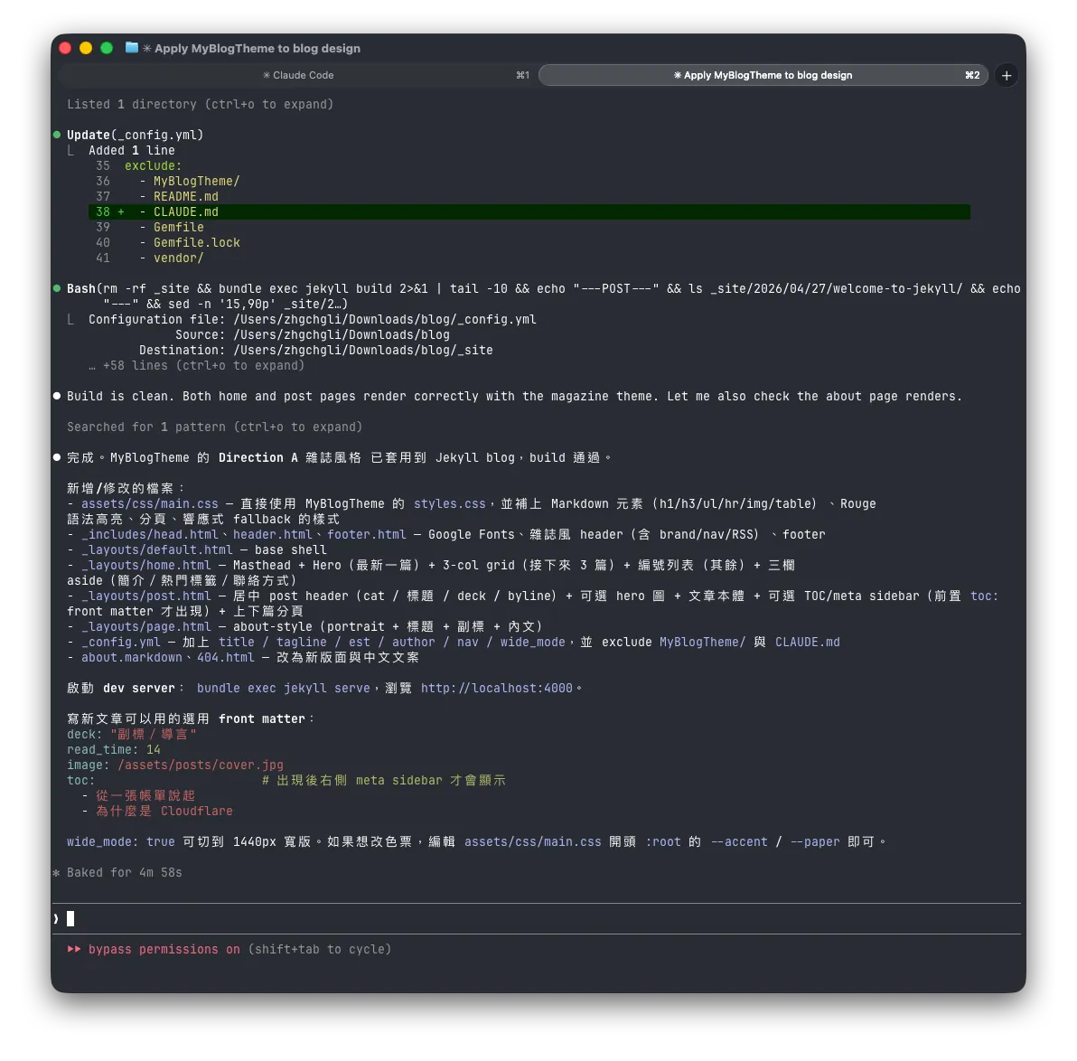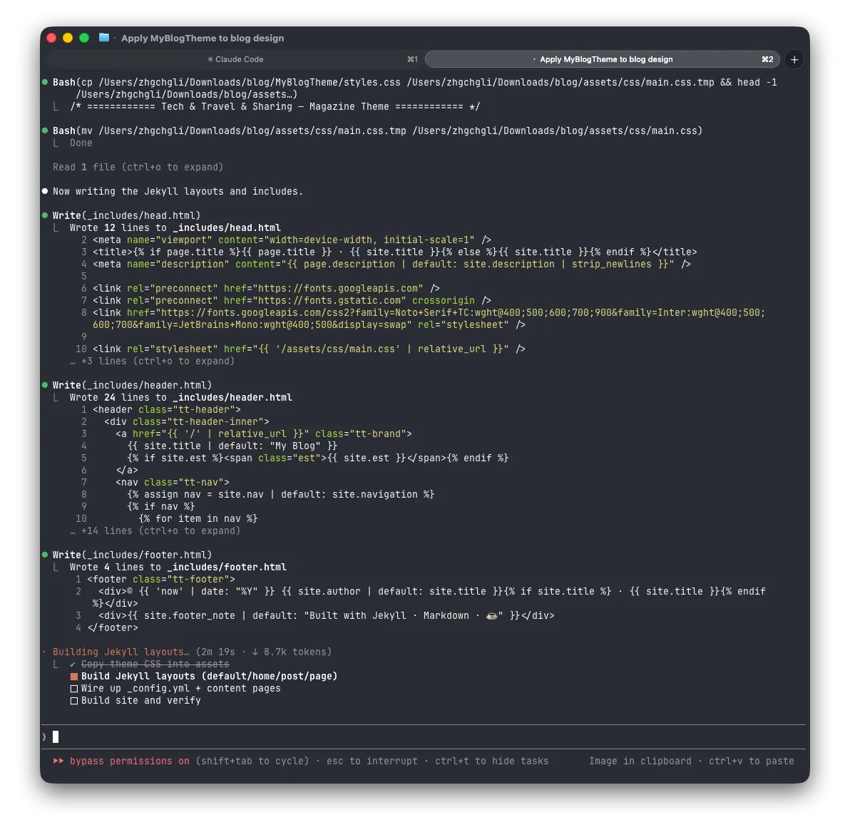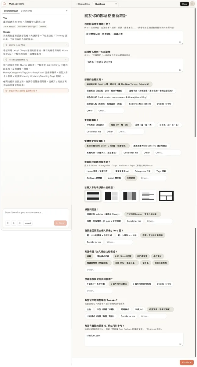 週末の午後を使って Claude Design で好きなブログのスタイルと機能をデザインし、Claude Code で実装して Jekyll ブログに適用しました。5年間使っていた Chirpy テーマのインターフェースを、自分の理想の個人ブログスタイルに完璧に置き換えました。