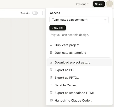 デザインに満足したら、右上の「Share」-> 「Download project as .zip」をクリックして、元のデザインファイルをダウンロードしてください: