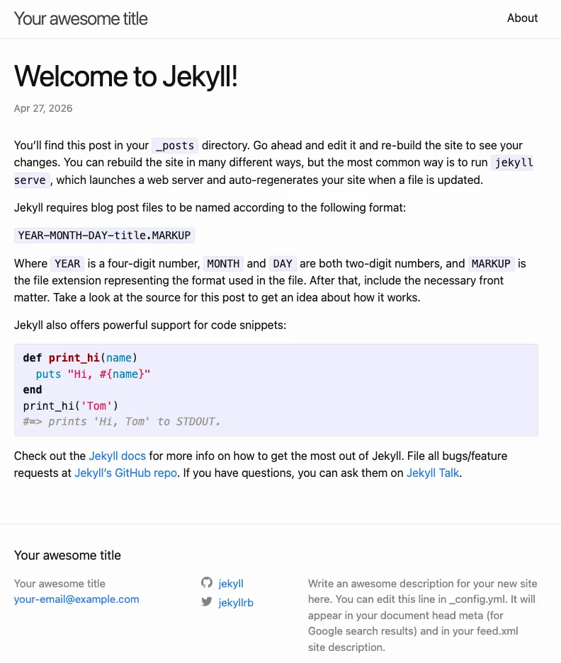 bundle exec jekyll serve を実行して、http://127.0.0.1:4000/ を開いて結果を確認します: