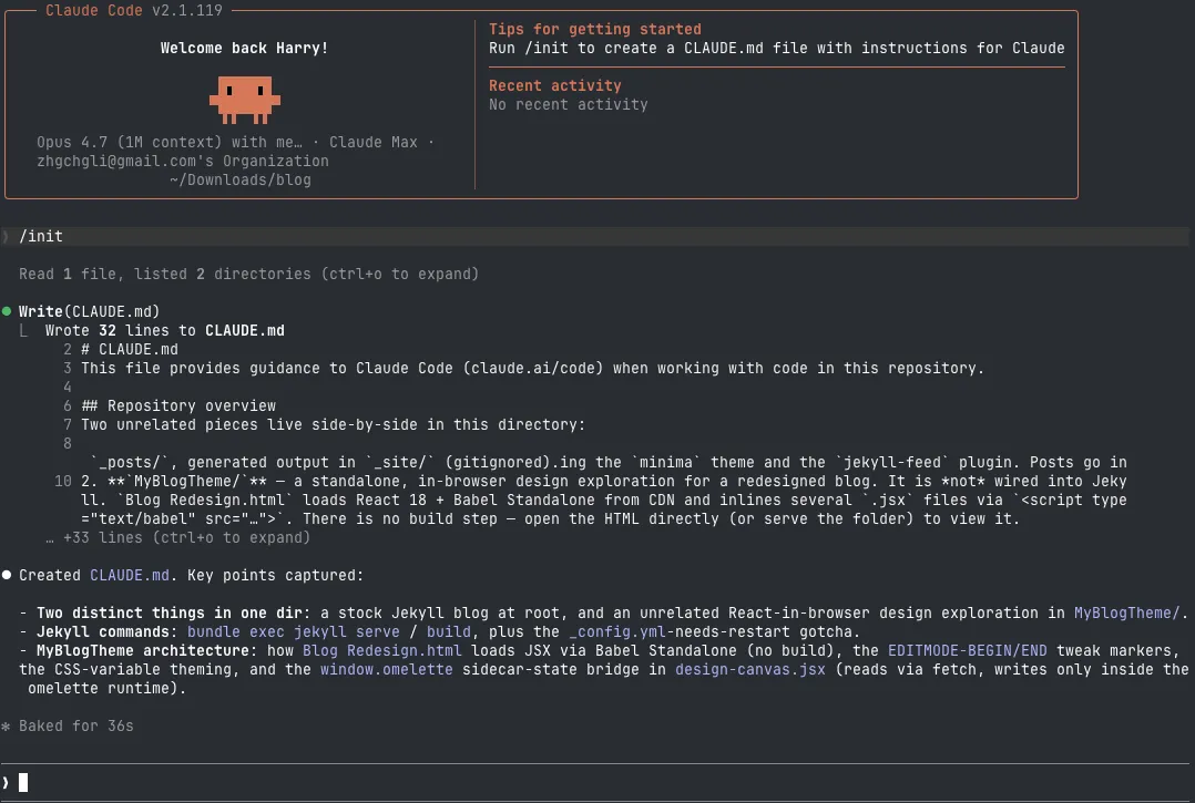 jekyll blog のディレクトリで一度 /init を実行して、AI に Jekyll Blog の構造を認識させてください。