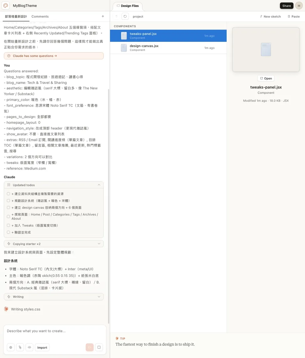 もし新しいページデザインの調整があれば、Claude Design に戻ってデザインを調整し、調整後に再度ダウンロードしてディレクトリに戻してください。直接 Claude Code に依頼しないでください。美的感覚はあまりありません。