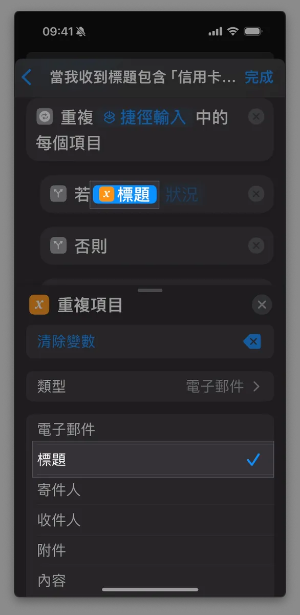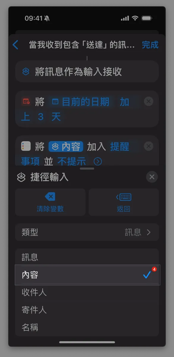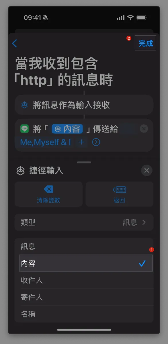 「捷徑輸入」傳送給「XXX」の「捷徑輸入」入力欄をクリックしてください。下のメニューを開き、元の選択「メッセージ」を「内容」に変更してください。