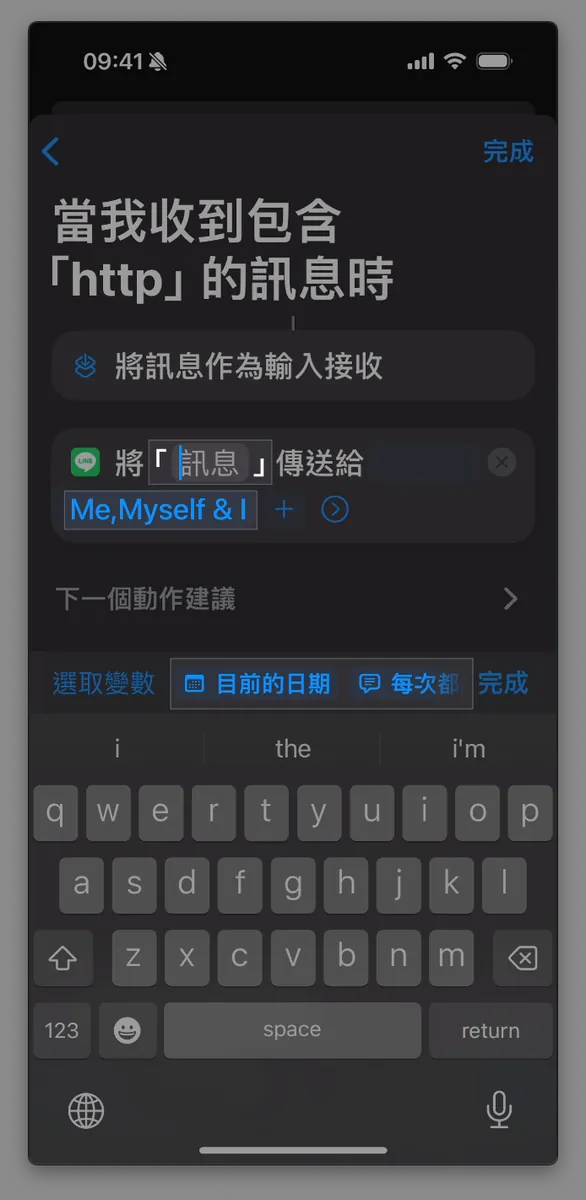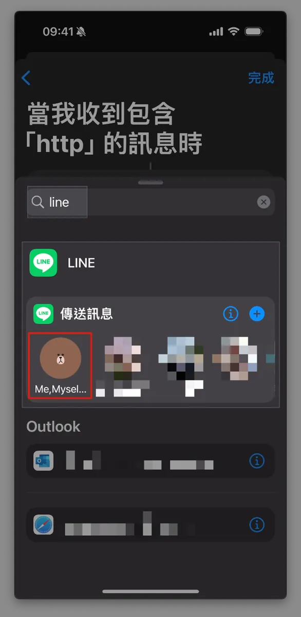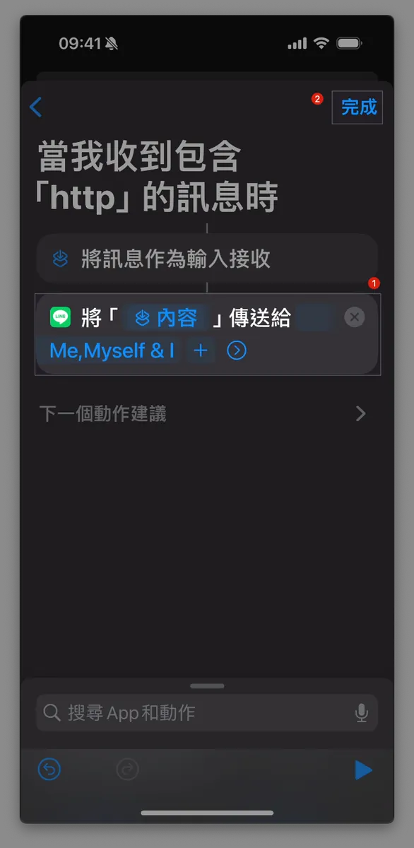 「XXX」を含むメッセージを受信したとき、そのメッセージを入力として受け取り、Lineで「内容」を「XXX」に送信する問題なければ右上の「完了」をタップしてください。