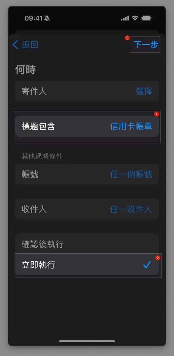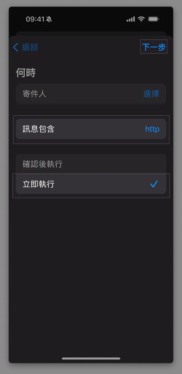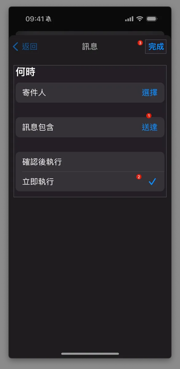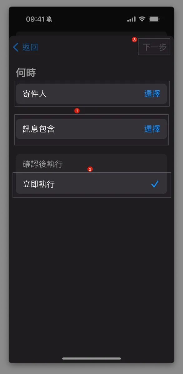 前文の自動メッセージ転送で紹介した「いつ」の条件と同様に、ここでは「メッセージ内容に『送達』を含む」と設定し、「すぐに実行」に変更します。