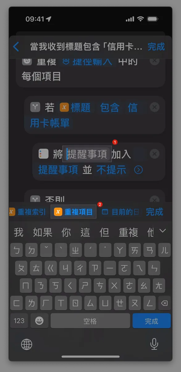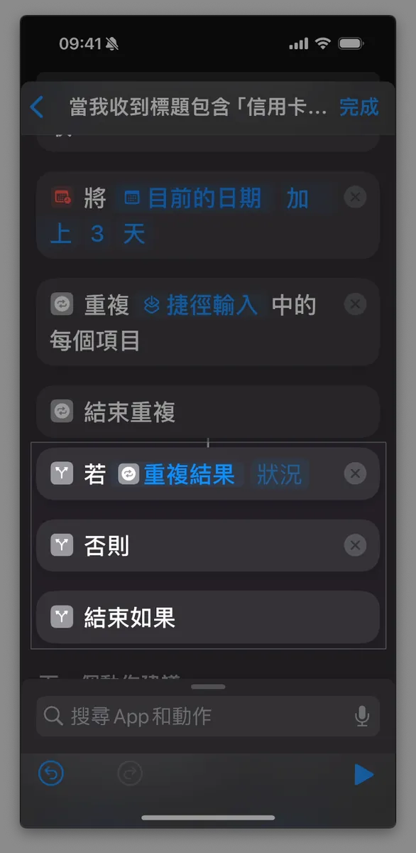 「重複結果」「状況」アクションを「重複「ショートカット入力」の各項目」の下(内側)にドラッグしてください。
