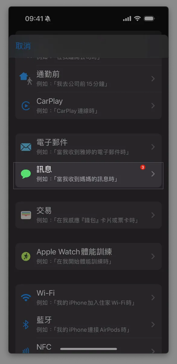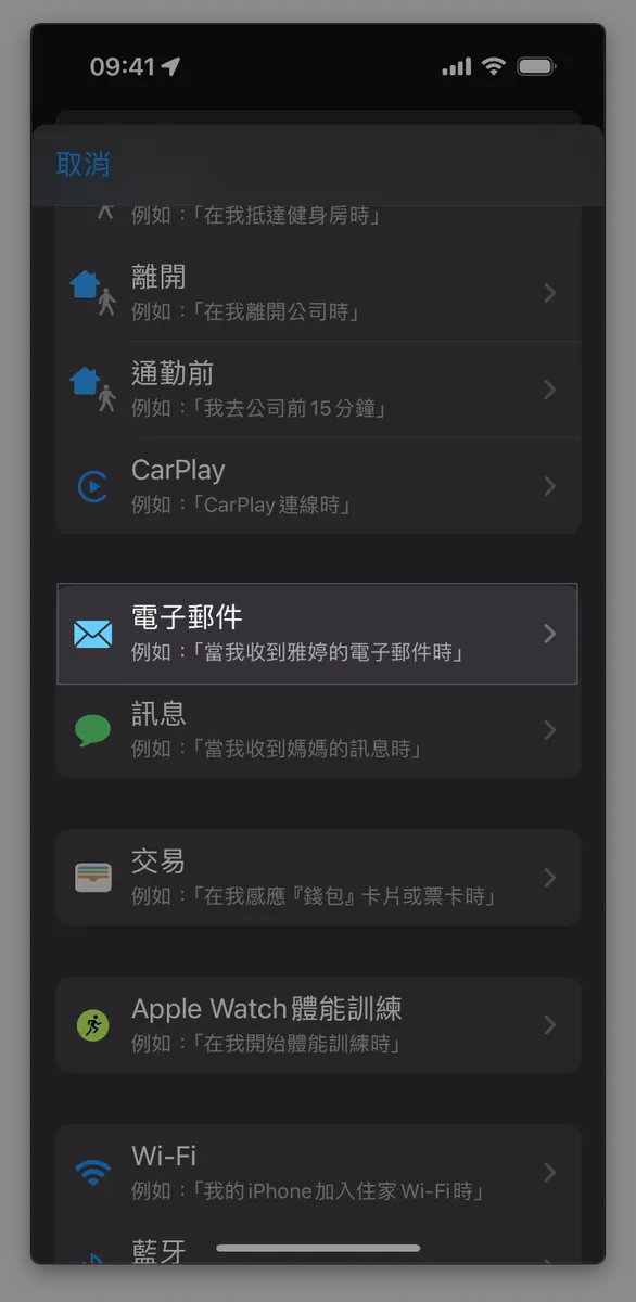 自動実行の条件は現在、iOS自身または自社のアプリに限られています。例えば、特定の時間、特定の場所への到着や出発、NFCの検知、メッセージやメールの受信、Wi-Fiへの接続、バッテリー残量、おやすみモード、音の検知などです。