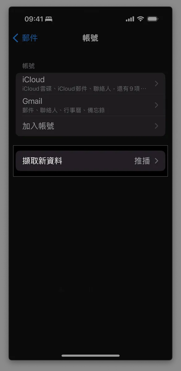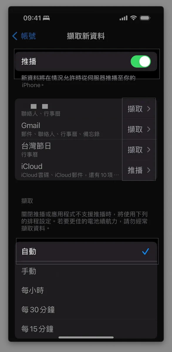 「設定」->「メール」->「アカウント」->「データ取得方法」を取得またはプッシュに設定してください。