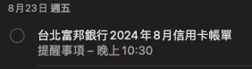 私は現在、Apple内蔵のリマインダーを生活のタスク管理ツールとして使っているので、例えば荷物のコンビニ受け取りやクレジットカードの支払い通知など、リマインドが必要なことも統合したいと思っています。