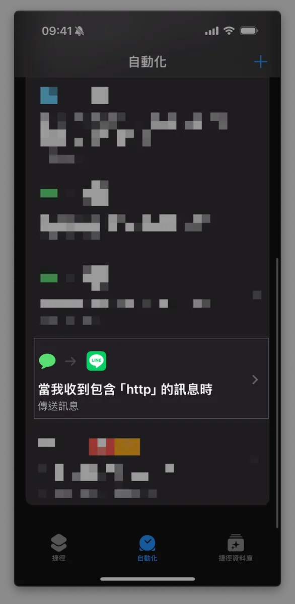 2.「自動化」タブに切り替え、右上の「+」を選択し、下にスクロールして「メッセージ」を見つける