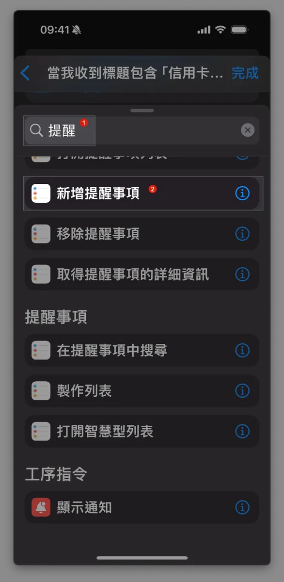 - 検索ボックスに「リマインダー」と入力し、下にスクロールして「リマインダーを追加」をタップします。