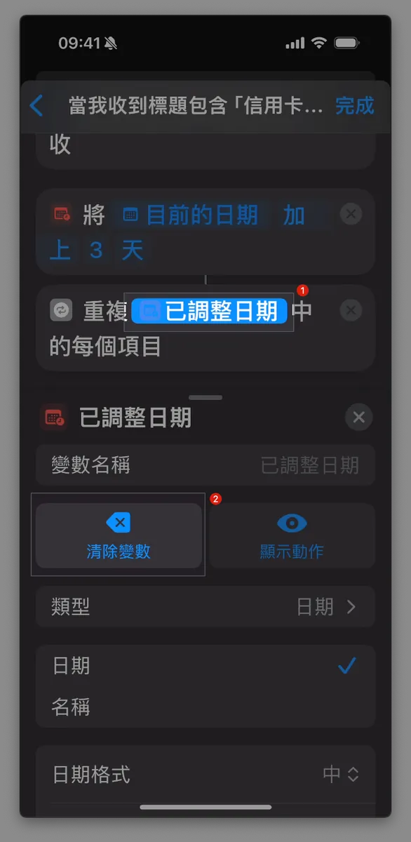「調整済みの日付」内の各項目を繰り返すの「調整済みの日付」入力欄で、「変数をクリア」を選択してください。クリアした後、