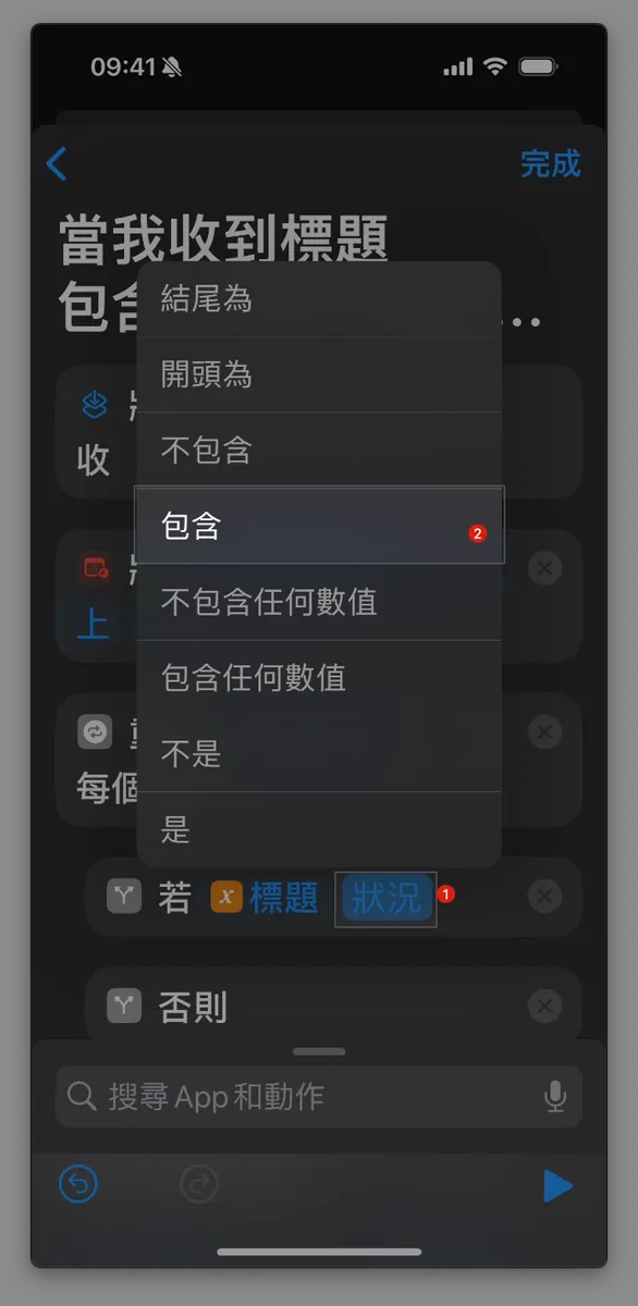 - 「タイトル」「条件」の「タイトル」入力欄をクリックし、「を含む」を選択して、「クレジットカード請求書」と入力し、キーボードの「完了」をタップしてください。