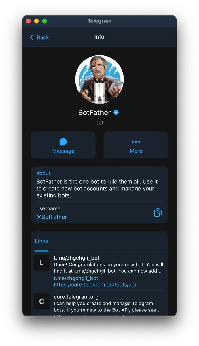 Telegram Bot の申請は非常に簡単で、ウェブページを開く必要もなく、公式の BotFather ボット とやり取りするだけで完了します。