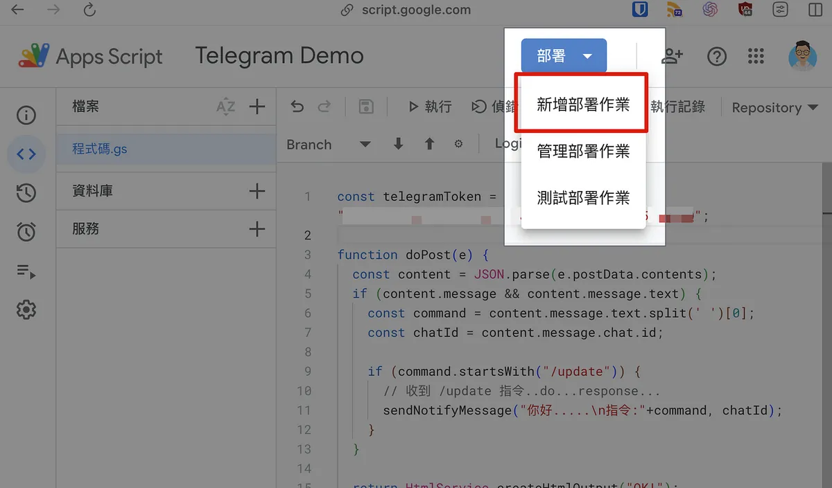 telegramToken=あなたの_BOT_API_Token上記のデモプログラムでは、Postリクエストを受け取り、Commandパラメータが