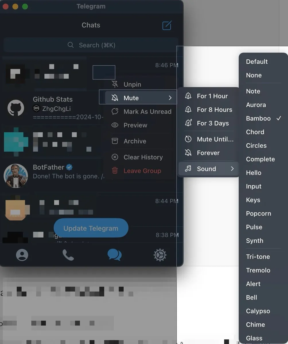 /updateTelegram Botコマンドを使ってGithubリポジトリのステータスを取得し、Telegram BotがGithub Statsグループに通知を送信します。